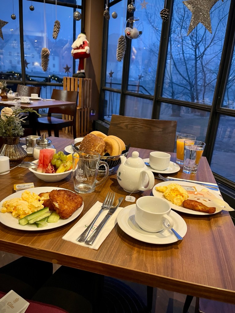 Dagen startet med en god hotellfrokost i Regensburg, komplett med utsikt over Donau.
