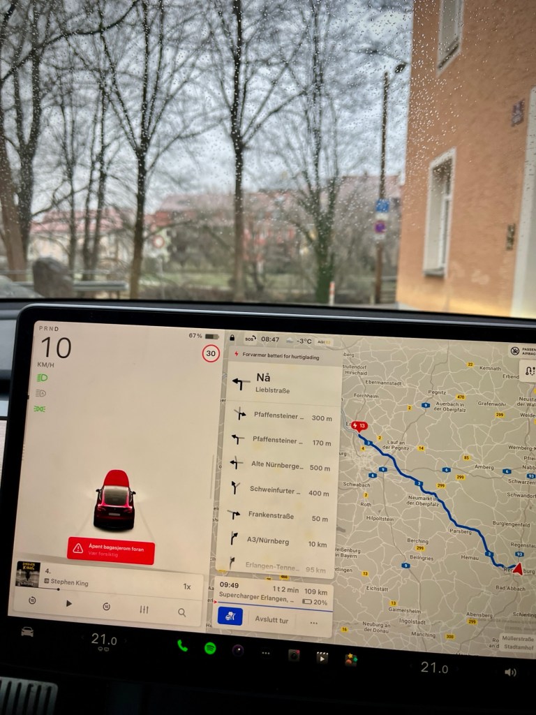 Vi var klare for å sette kursen mot Koblenz da vi ble møtt av en kjent lyd og melding fra bilen: “Panser åpent.” Det ser ut til at Tesla-sensoren ikke helt har forstått oppgaven sin, for problemet var tilbake