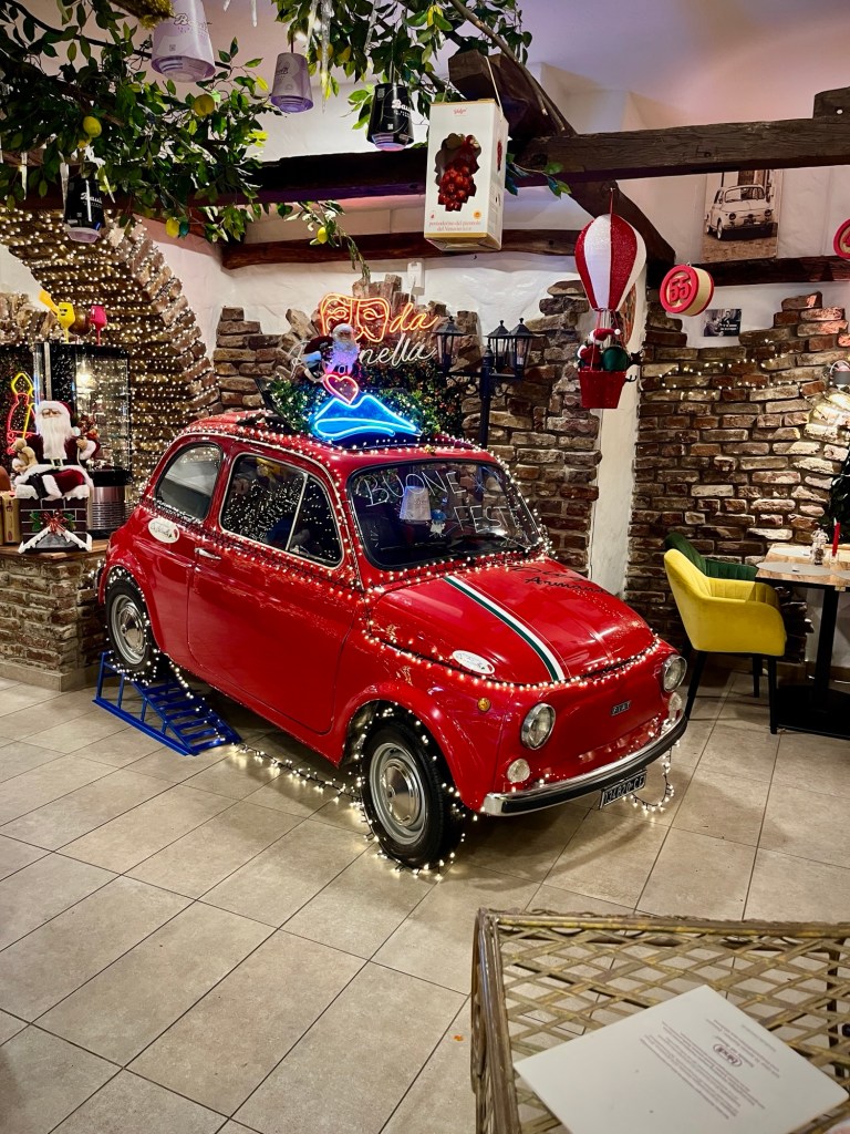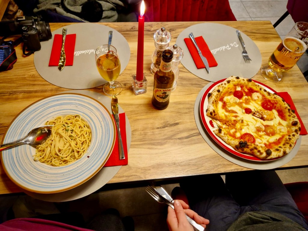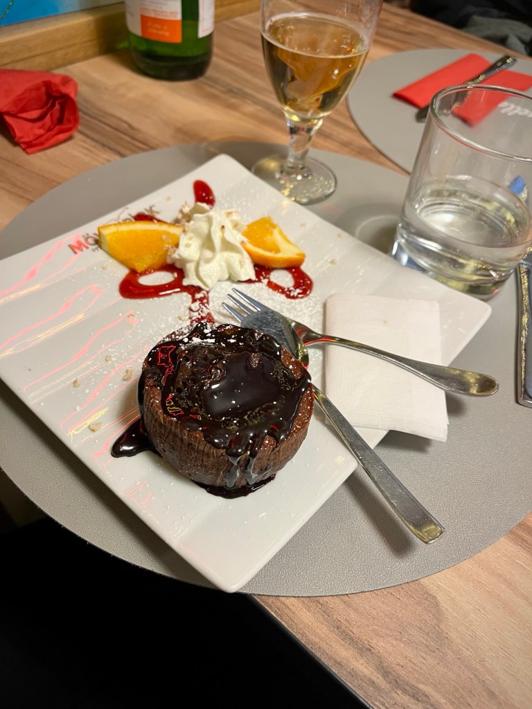 Tilbake i byen fant vi en italiensk restaurant som var så opplyst av julelys at den kunne konkurrert med Times Square. Maten var fantastisk og vi bestilte til og med turens første dessert.