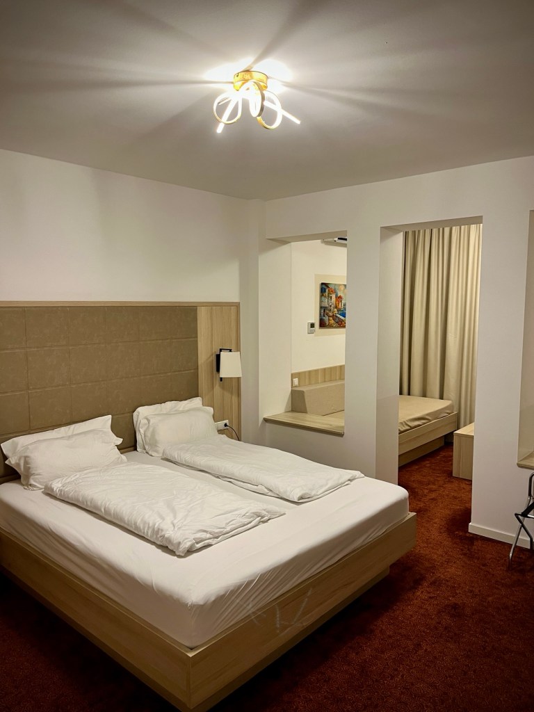Vi sjekket inn på hotellet, som bød på et romslig rom med god plass til både oss og all bagasjen vi har samlet opp.