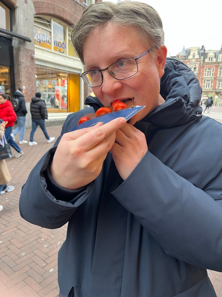 Etter frokosten gikk vi rundt i butikker mens vi ventet på at en spesiell butikk skulle åpne. Stian fant en hjemmelaget stroopwafel underveis, og det var et høydepunkt (den fikk hele 8/10 fra ham).
