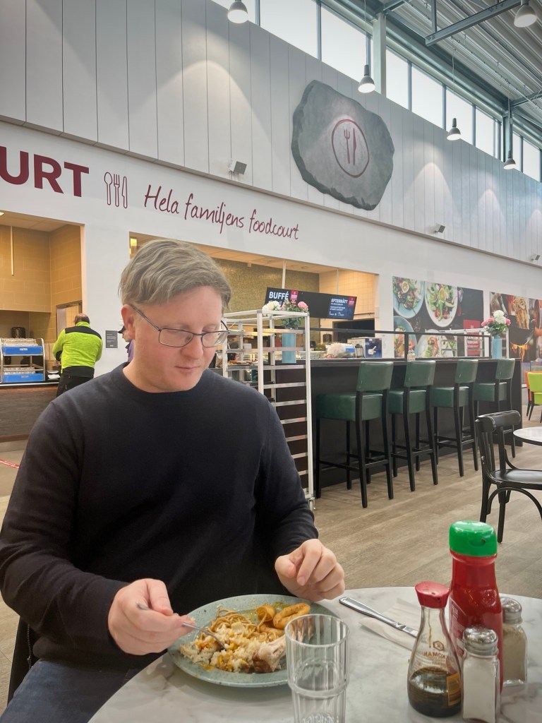 We stopped for lunch in Tanumshede – and yes, it was another buffet. This one was surprisingly good, with plenty of tasty options. Afterward, we made a quick grocery stop while the Tesla charged to 100%.
